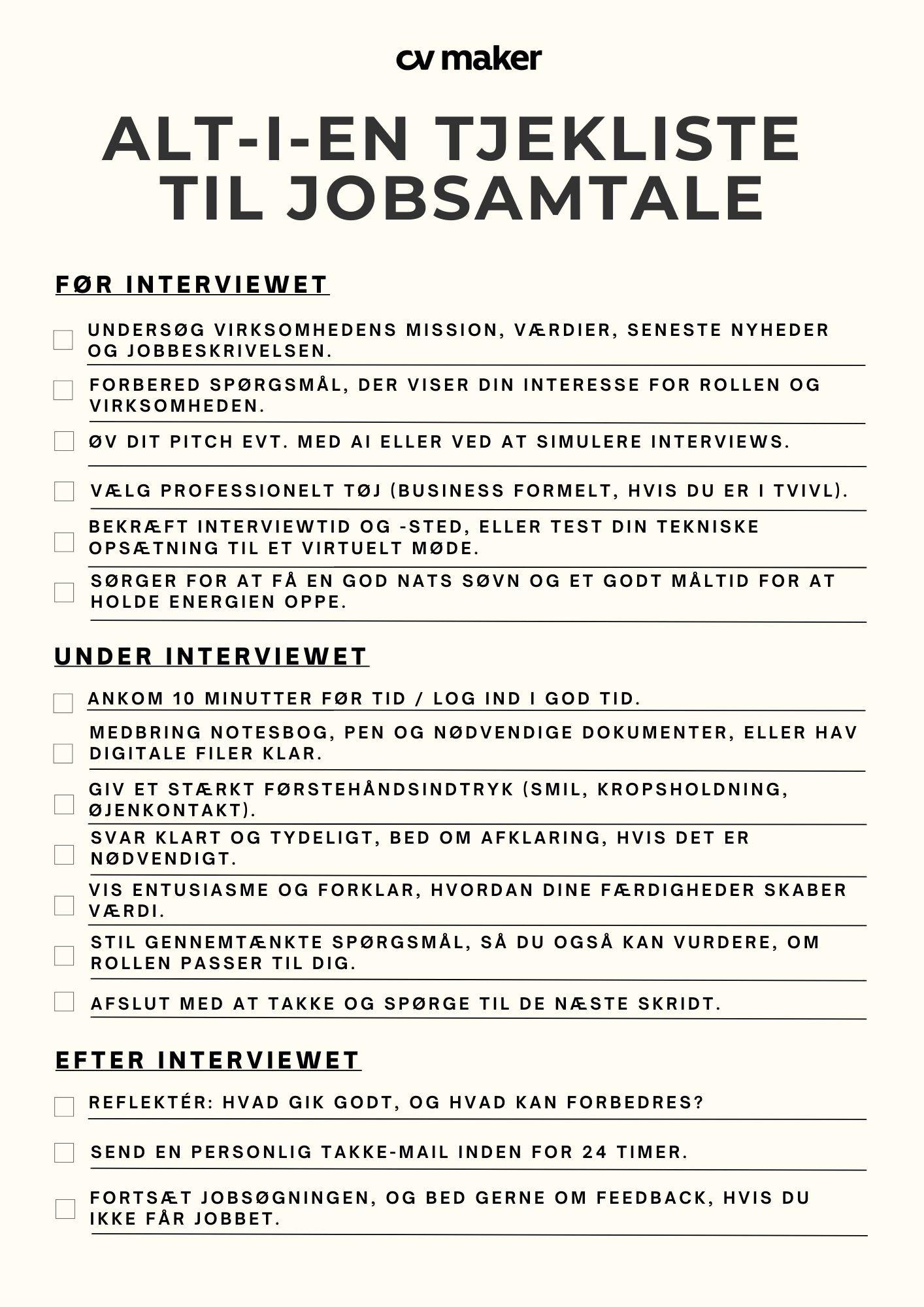 - Tjekliste til hvordan man forberedelser sig til jobsamtale.