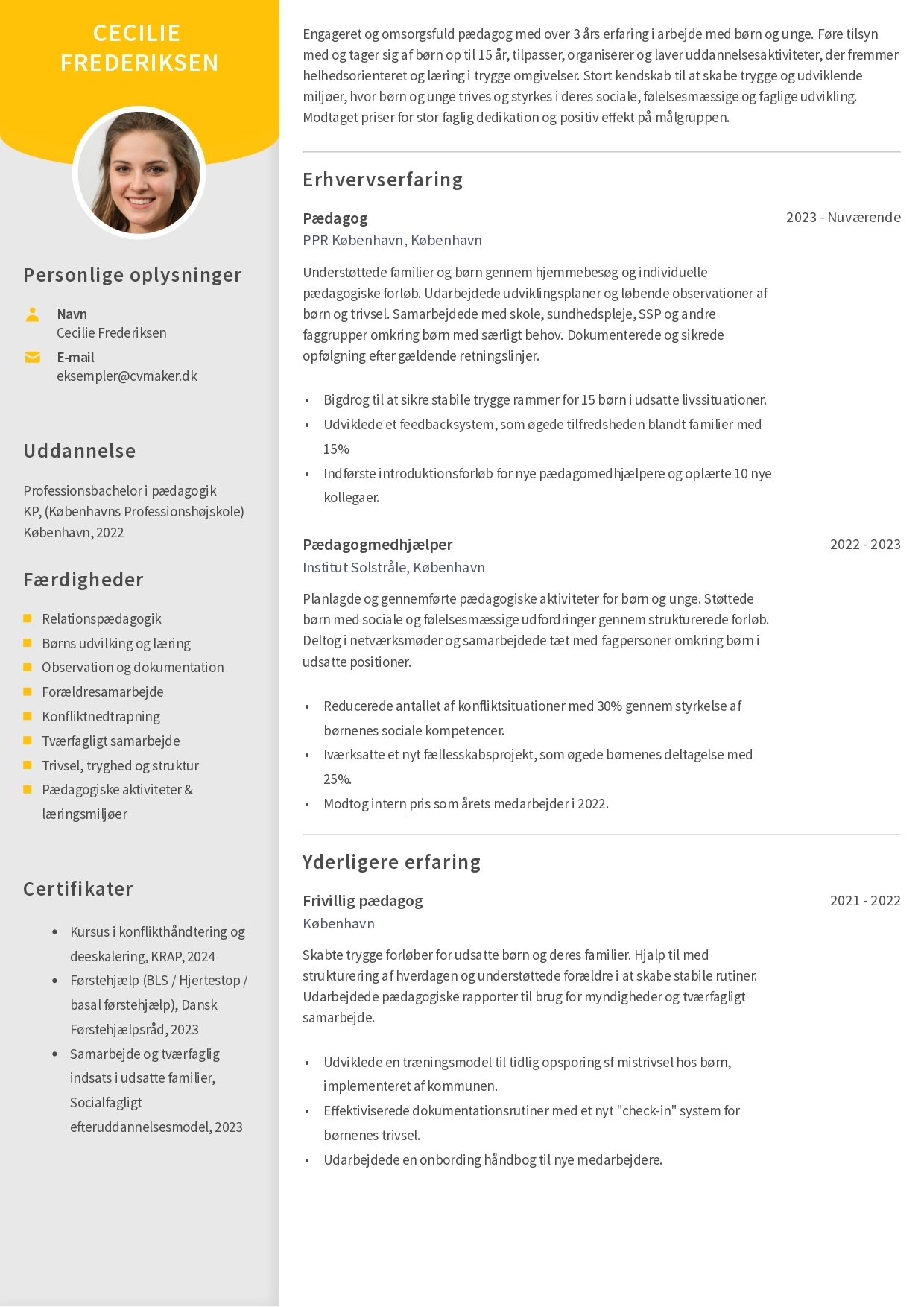 - Inspiration fra et eksempel på pædagog-CV, så du kan se, hvordan det kan se ud i praksis.